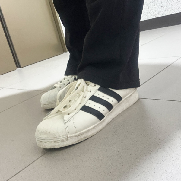 특히 블랙 슬랙스에 흰 티셔츠, 그리고 슈퍼스타를 매치하면