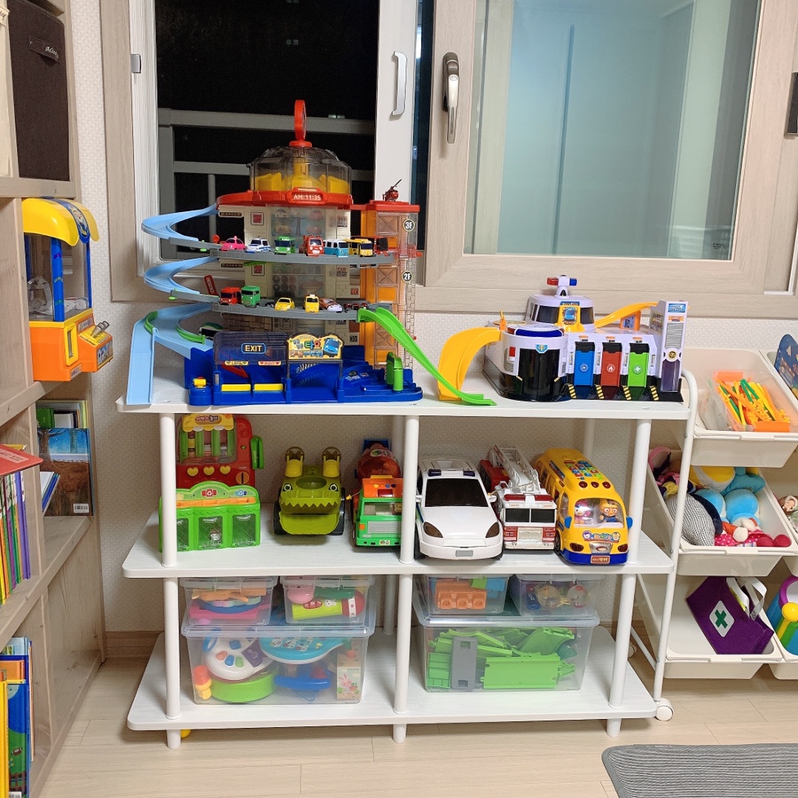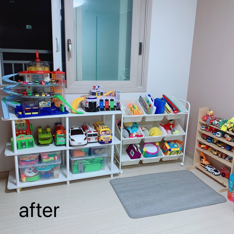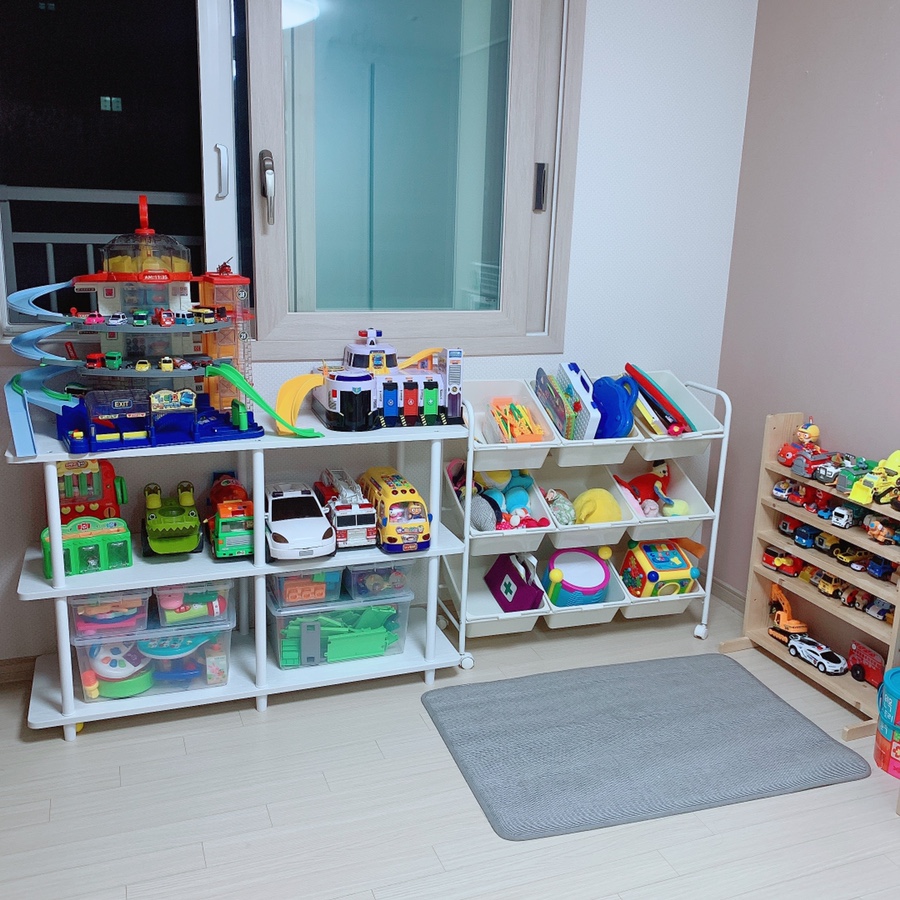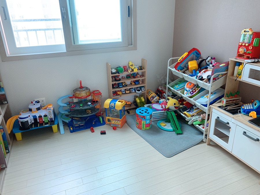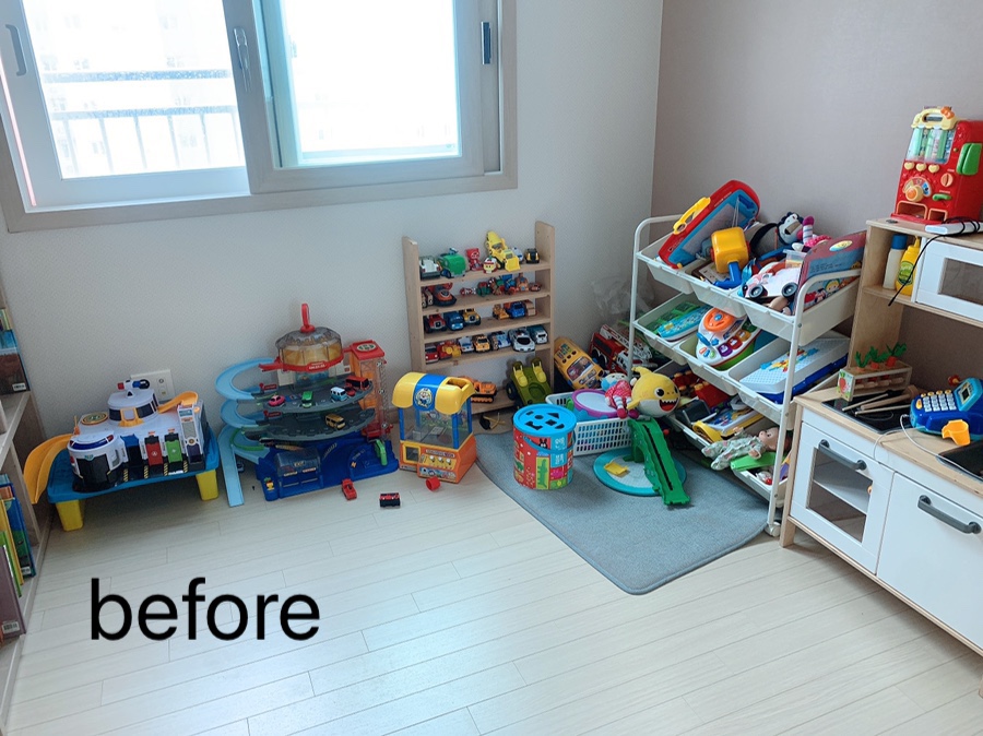 아이들 장난감 중에 부피가 큰 장난감들이 바닥에 널부러져있었어요.