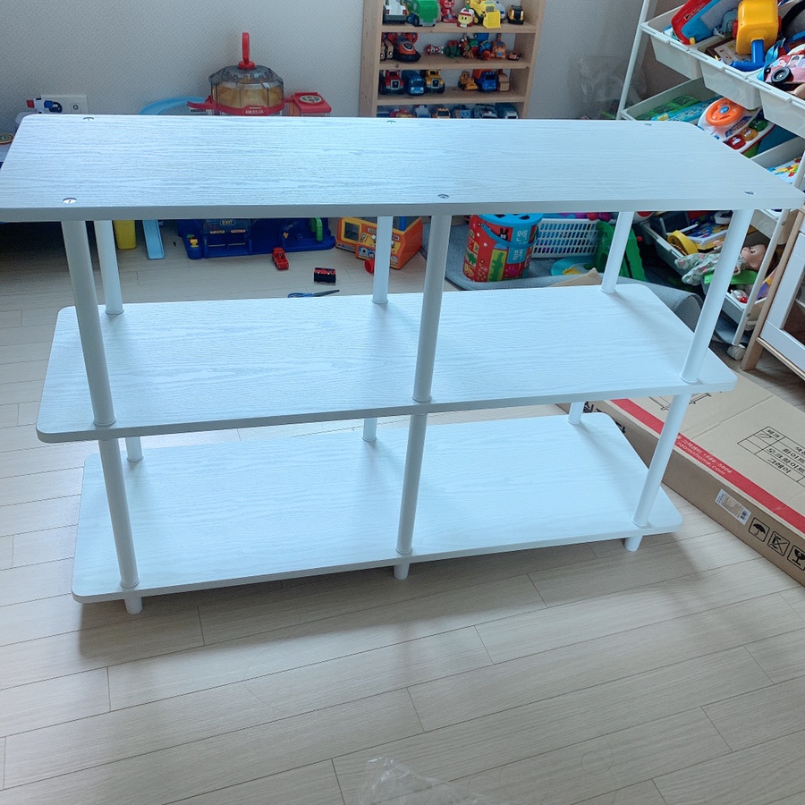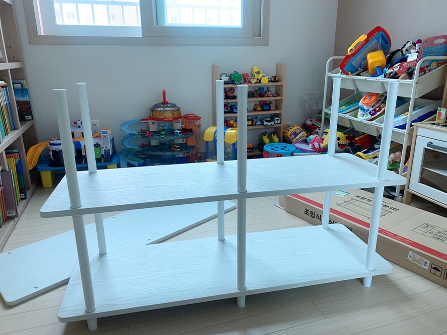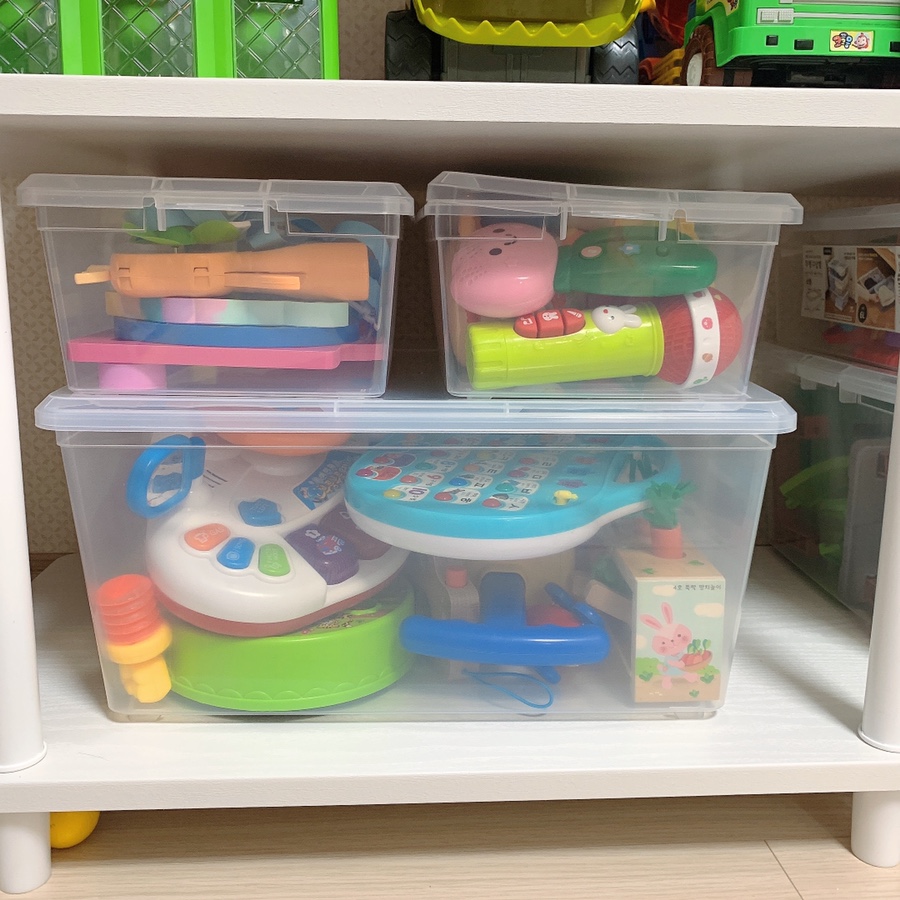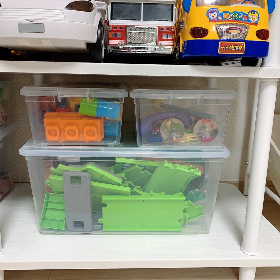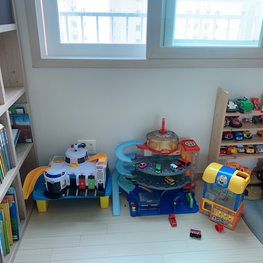 아이들 장난감 중에 부피가 큰 장난감들이 바닥에 널부러져있었어요.