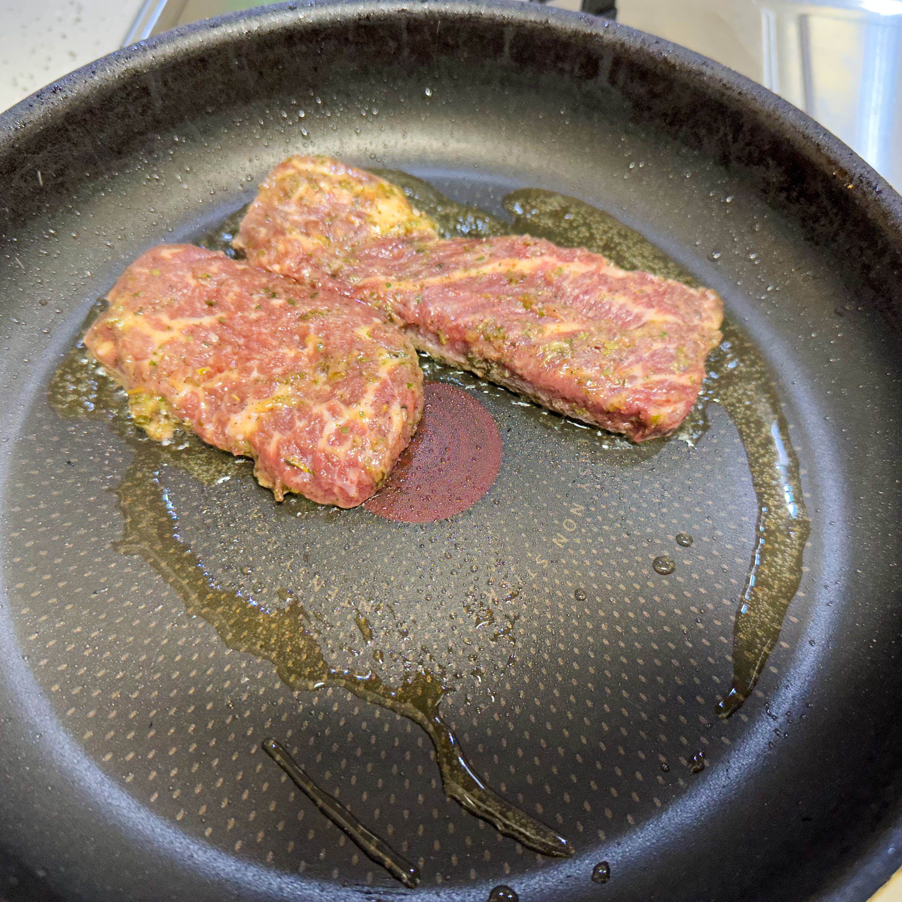 예열한 팬에 살치 스테이크를